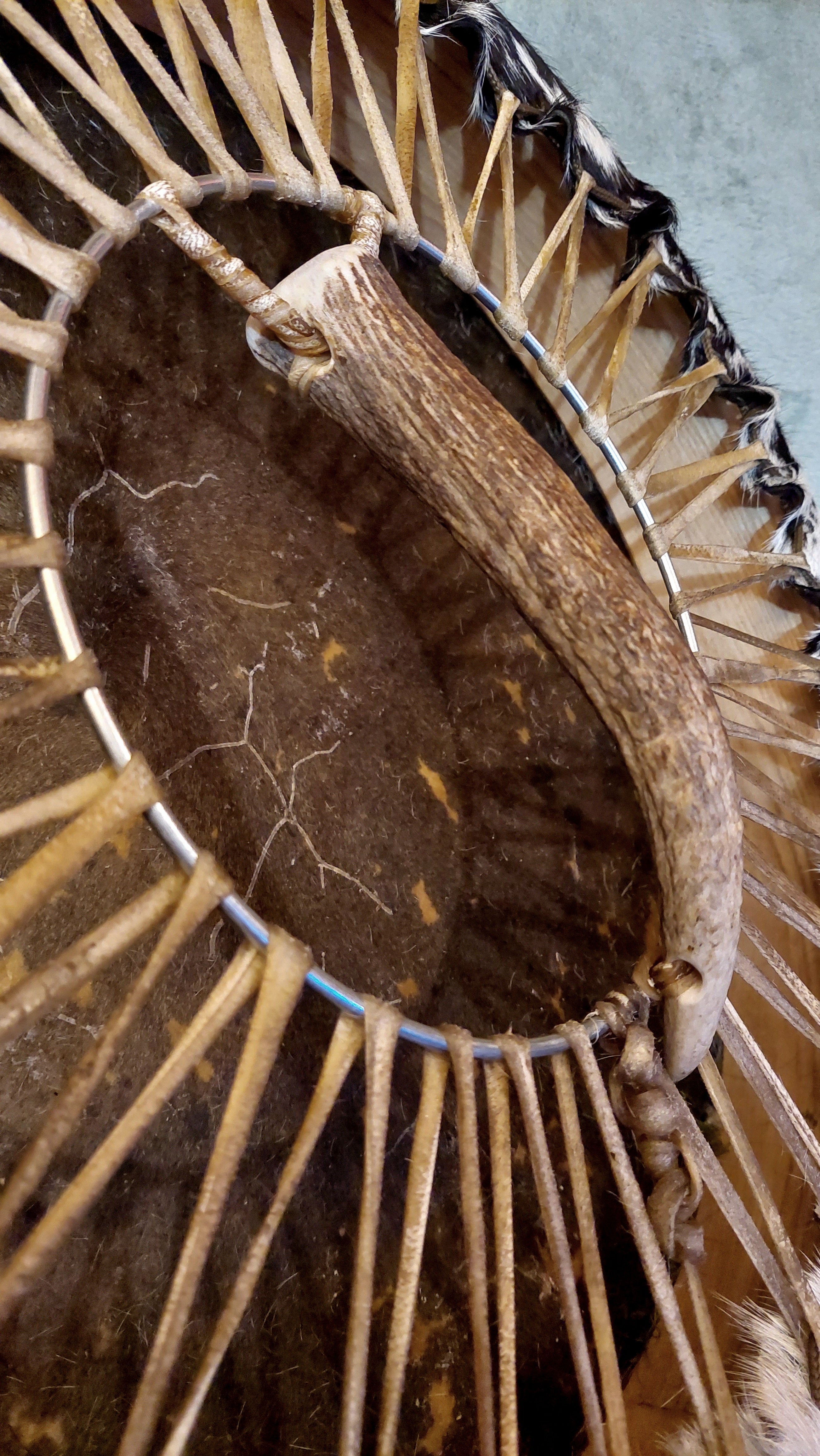 Poignée en bois de cerf, cordage en peau crue naturelle.